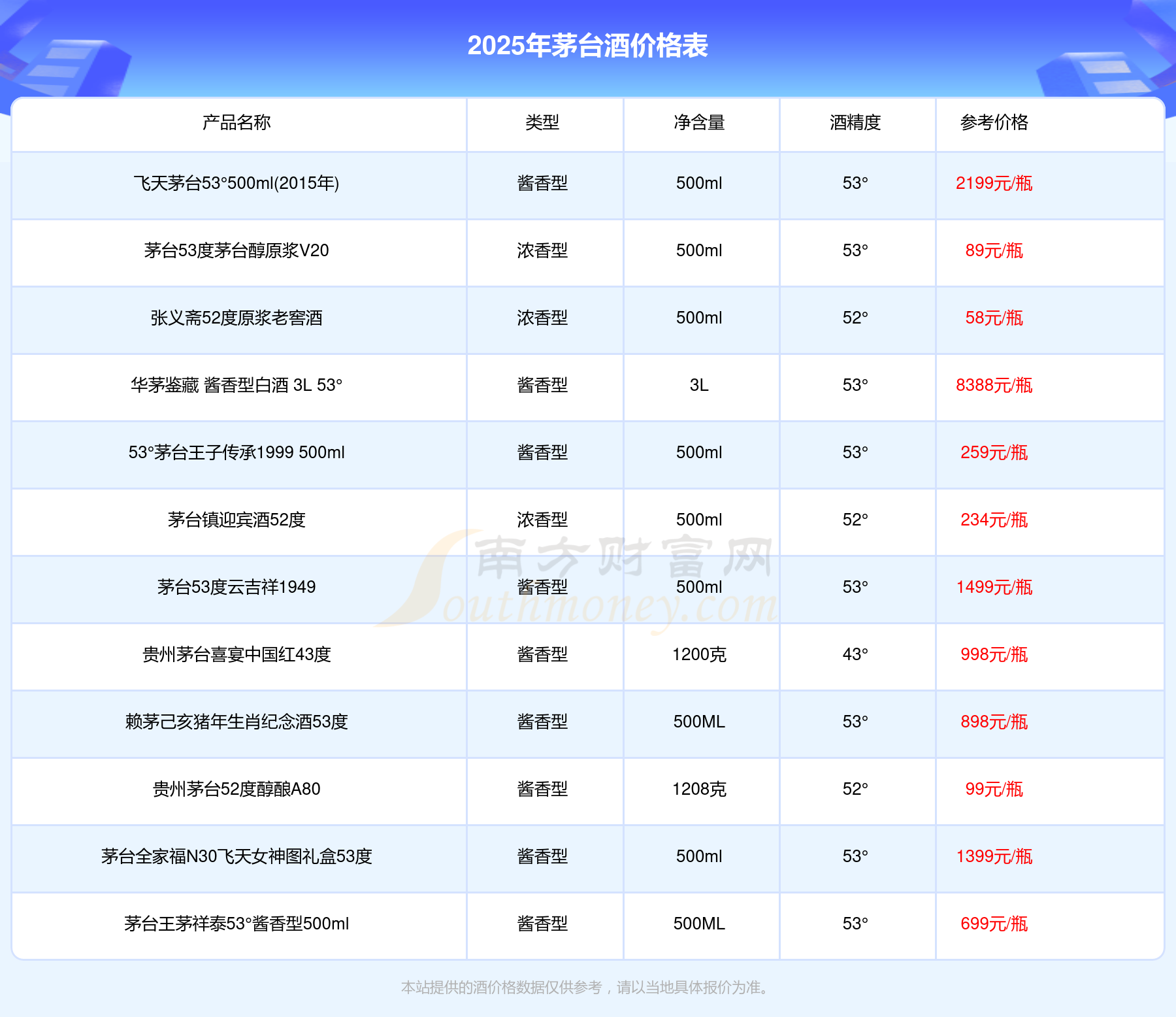 2025年,华茅鉴藏 酱香型白酒 3L 53°、53度五星茅台生肖酒丁酉鸡年、贵州茅台己亥猪年生肖酒53°500ml、53度五星茅台生肖酒戊戌狗年、飞天茅台53°500ml(2015年)、茅台王子酒己亥猪年生肖纪念酒53度2.5L等茅台酒价格如下:华茅鉴藏 酱香型白酒 3L 53°参考价8388元/瓶、53度五星茅台生肖酒丁酉鸡年参考价2798元/瓶、贵州茅台己亥猪年生肖酒53°500ml参考价2699元/瓶、53度五星茅台生肖酒戊戌狗年参考价2698元/瓶、飞天茅台53°500ml(2015年)参考价2199元/瓶、茅台王子酒己亥猪年生肖纪念酒53度2.5L参考价2099元/瓶。