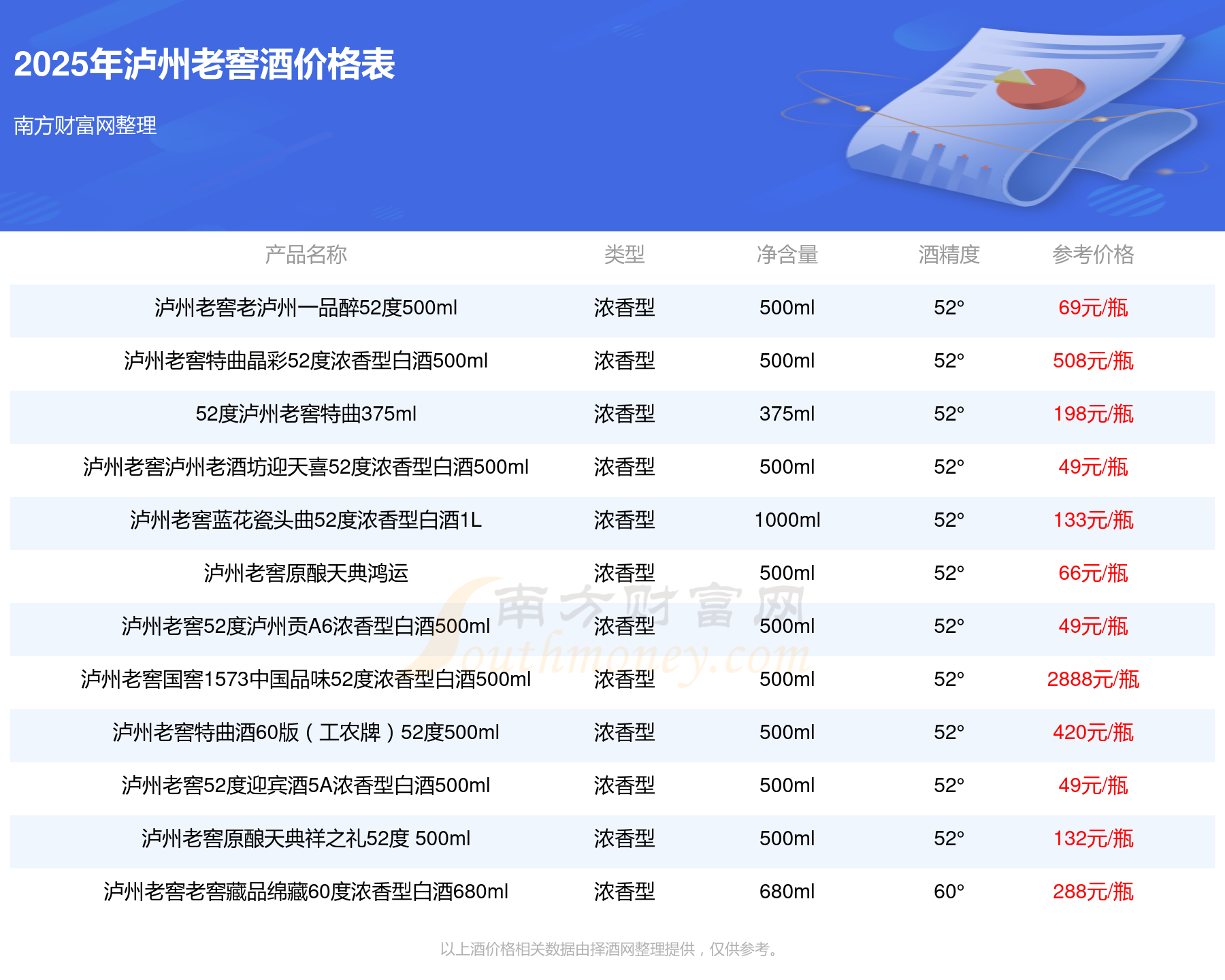 泸州老窖酒最新价格2025:泸州老窖国窖1573春酿鼠兆丰年E 55度参考价17999元/瓶、泸州老窖国窖1573生命中的那坛酒55度014参考价9999元/瓶、泸州老窖国窖1573春酿鼠兆丰年A 55度参考价5088元/瓶、泸州老窖国窖1573生命中的那坛酒55度013浓香型白酒1000ml参考价4988元/瓶。