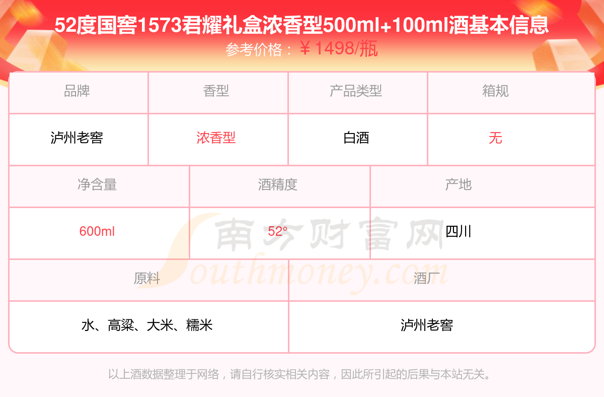 52度国窖1573君耀礼盒浓香型500ml+100ml基本信息