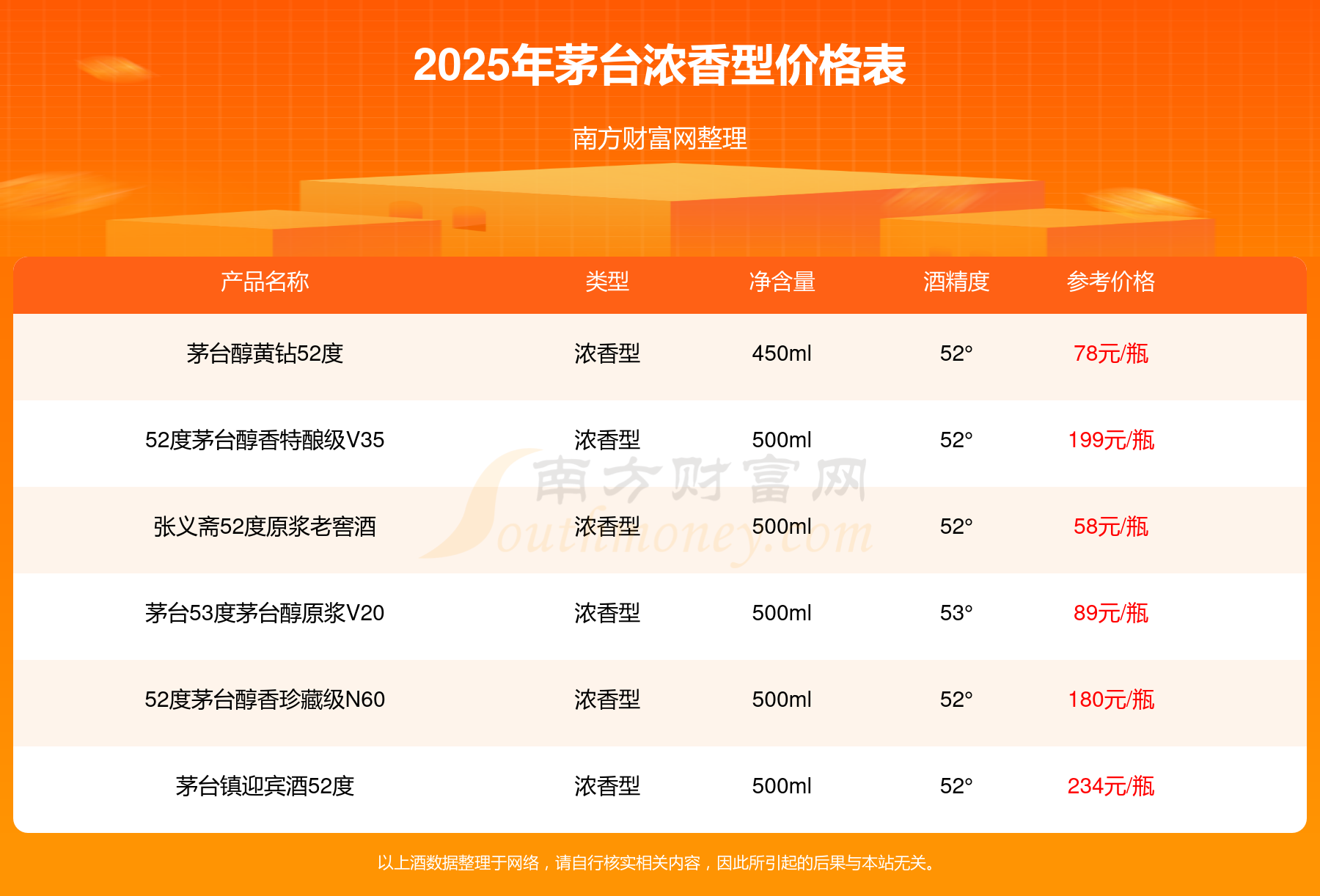 茅台镇迎宾酒52度参考价234元/瓶、52度茅台醇香特酿级V35参考价199元/瓶、52度茅台醇香珍藏级N60参考价180元/瓶、茅台53度茅台醇原浆V20参考价89元/瓶、茅台醇黄钻52度参考价78元/瓶。