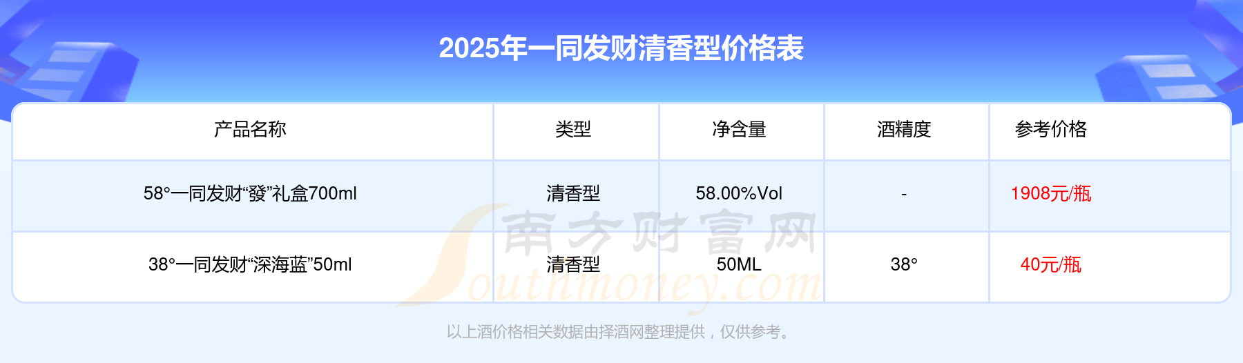 一同发财清香型酒最新价格2025:58°一同发财“發”礼盒700ml参考价1908元/瓶、38°一同发财“深海蓝”50ml参考价40元/瓶。