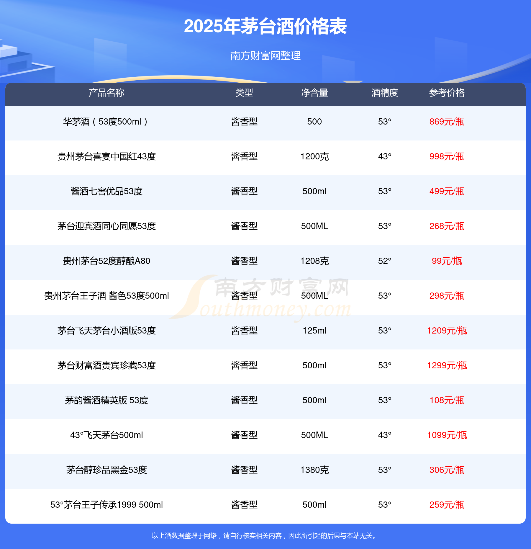 2025年,华茅鉴藏 酱香型白酒 3L 53°、53度五星茅台生肖酒丁酉鸡年、贵州茅台己亥猪年生肖酒53°500ml、53度五星茅台生肖酒戊戌狗年、飞天茅台53°500ml(2015年)、茅台王子酒己亥猪年生肖纪念酒53度2.5L、茅台1935酱香型53度、茅台财富贵宾典藏酒53度等茅台酒价格如下:华茅鉴藏 酱香型白酒 3L 53°参考价8388元/瓶、53度五星茅台生肖酒丁酉鸡年参考价2798元/瓶、贵州茅台己亥猪年生肖酒53°500ml参考价2699元/瓶、53度五星茅台生肖酒戊戌狗年参考价2698元/瓶、飞天茅台53°500ml(2015年)参考价2199元/瓶、茅台王子酒己亥猪年生肖纪念酒53度2.5L参考价2099元/瓶、茅台1935酱香型53度参考价1799元/瓶、茅台财富贵宾典藏酒53度参考价1599元/瓶。