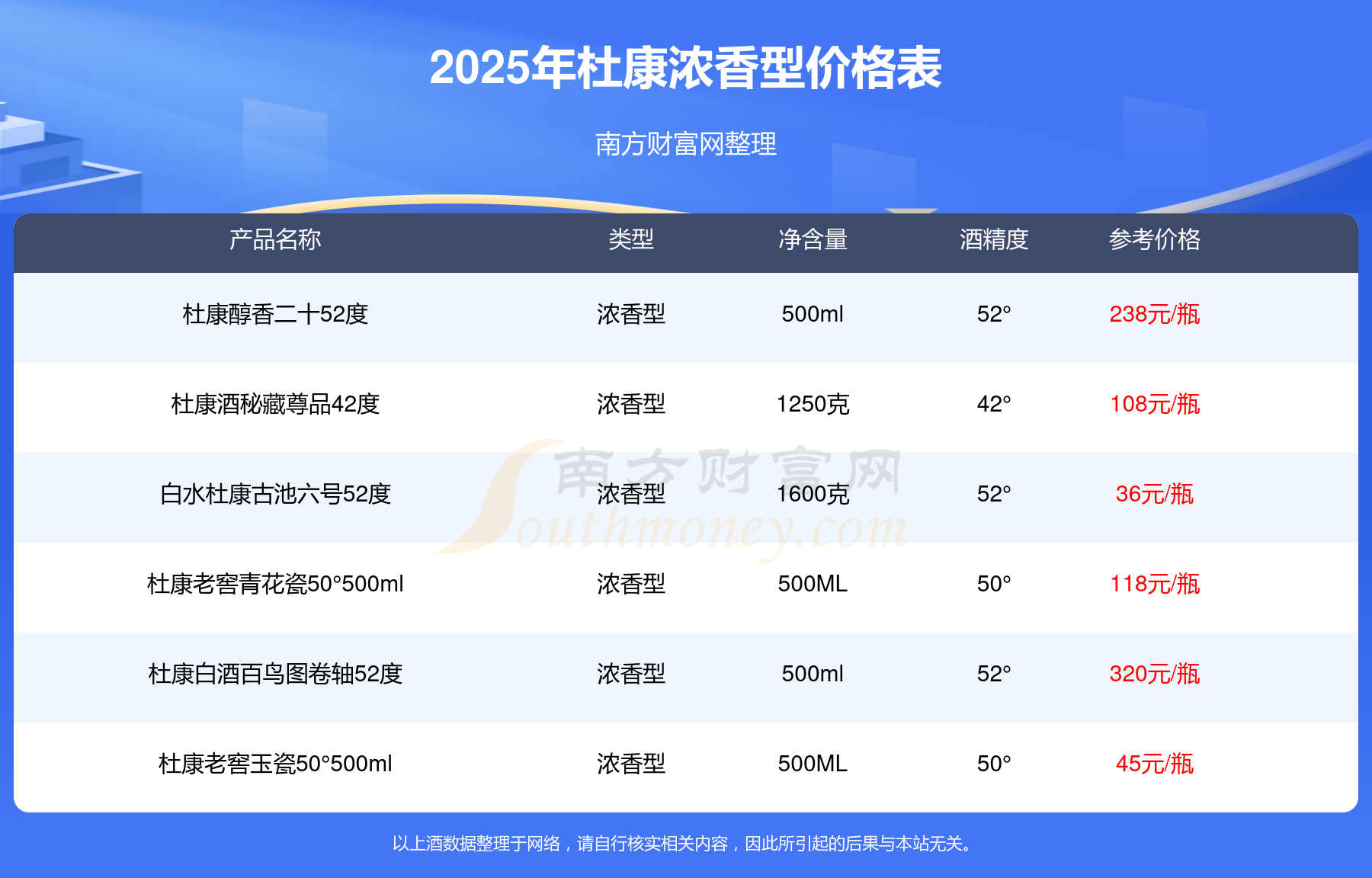 2025年杜康浓香型酒杜康白酒百鸟图卷轴52度、杜康醇香二十52度、杜康老窖青花瓷50°500ml、杜康酒秘藏尊品42度等最新价格如下:杜康白酒百鸟图卷轴52度参考价320元/瓶、杜康醇香二十52度参考价238元/瓶、杜康老窖青花瓷50°500ml参考价118元/瓶、杜康酒秘藏尊品42度参考价108元/瓶。