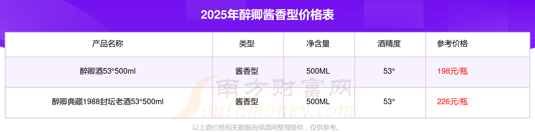2025年,醉卿酱香型酒价格最高的是醉卿典藏1988封坛老酒53°500ml,参考价226元,最低的是醉卿酒53°500ml,参考价198元,价格高低差为28元。