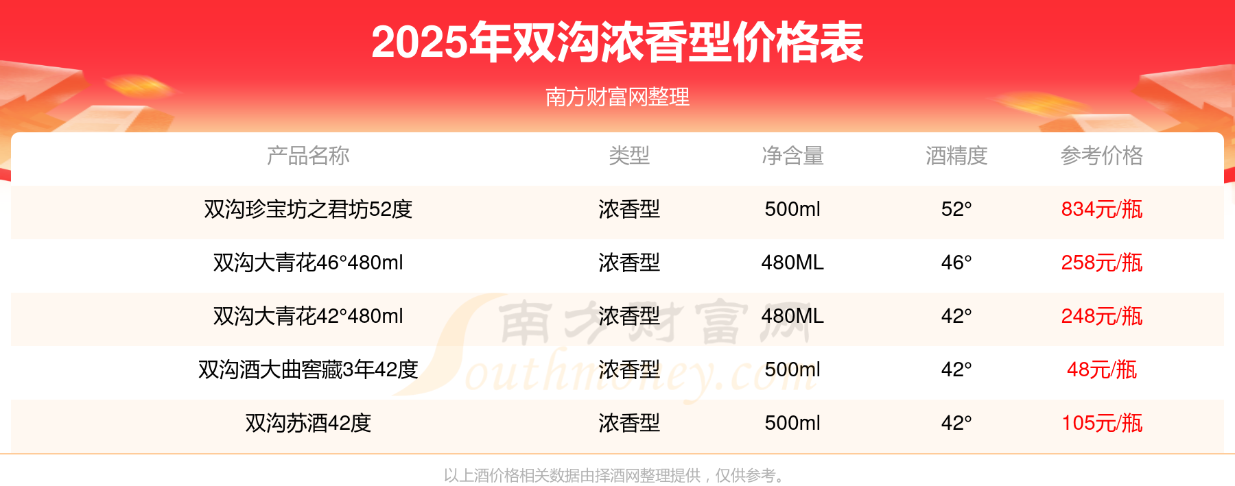 双沟浓香型酒最新价格2025:双沟珍宝坊之君坊52度参考价834元/瓶、双沟大青花46°480ml参考价258元/瓶、双沟大青花42°480ml参考价248元/瓶。