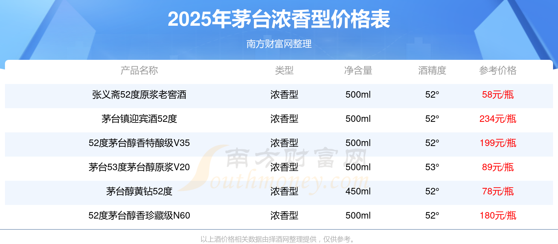 2025年,茅台镇迎宾酒52度、52度茅台醇香特酿级V35、52度茅台醇香珍藏级N60、茅台53度茅台醇原浆V20、茅台醇黄钻52度、张义斋52度原浆老窖酒等茅台浓香型酒价格如下: