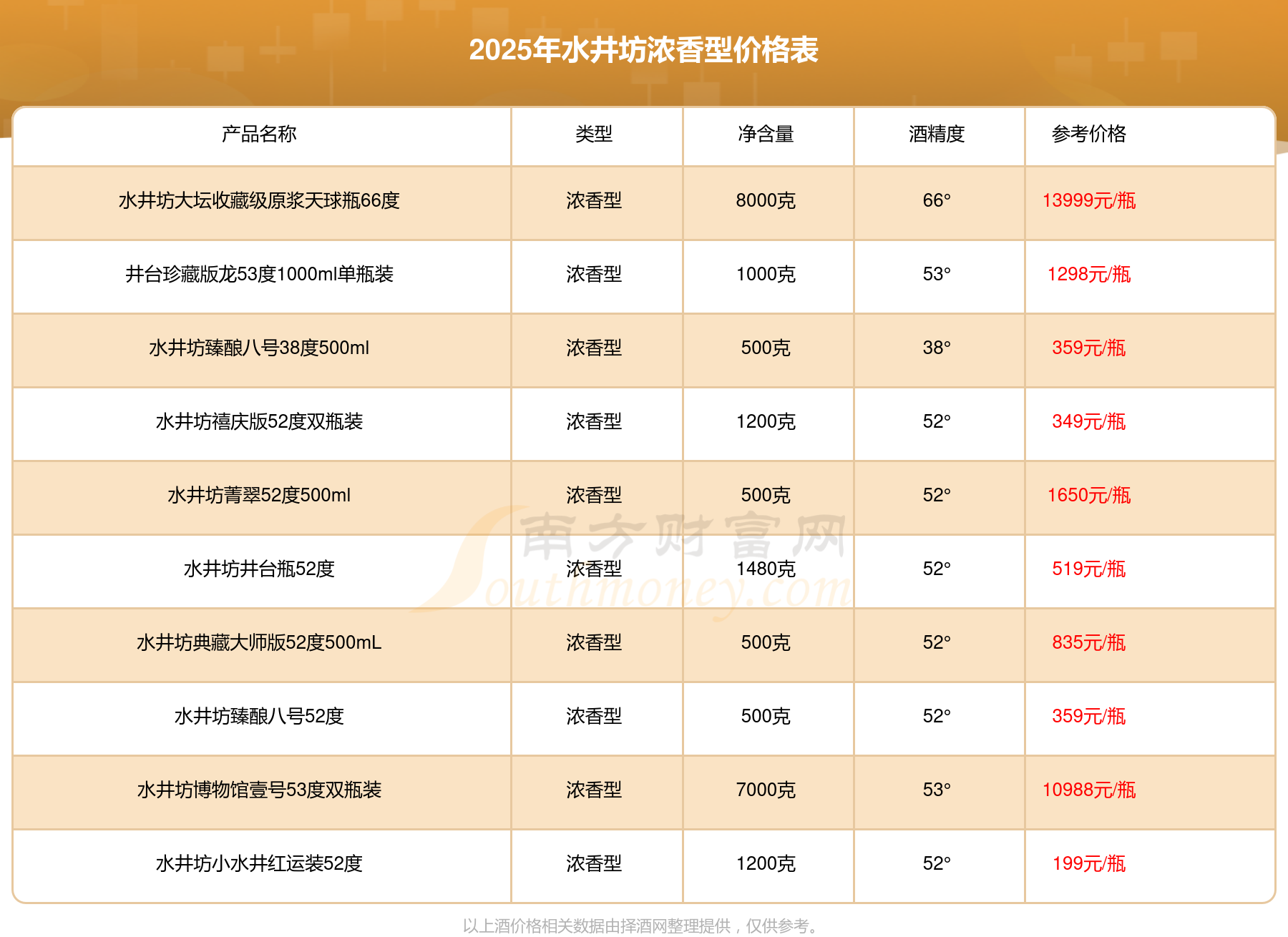 2025年水井坊浓香型酒水井坊大坛收藏级原浆天球瓶66度、水井坊博物馆壹号53度双瓶装、53°水井坊公元十三600ml等最新价格如下:水井坊大坛收藏级原浆天球瓶66度参考价13999元/瓶、水井坊博物馆壹号53度双瓶装参考价10988元/瓶、53°水井坊公元十三600ml参考价2580元/瓶。