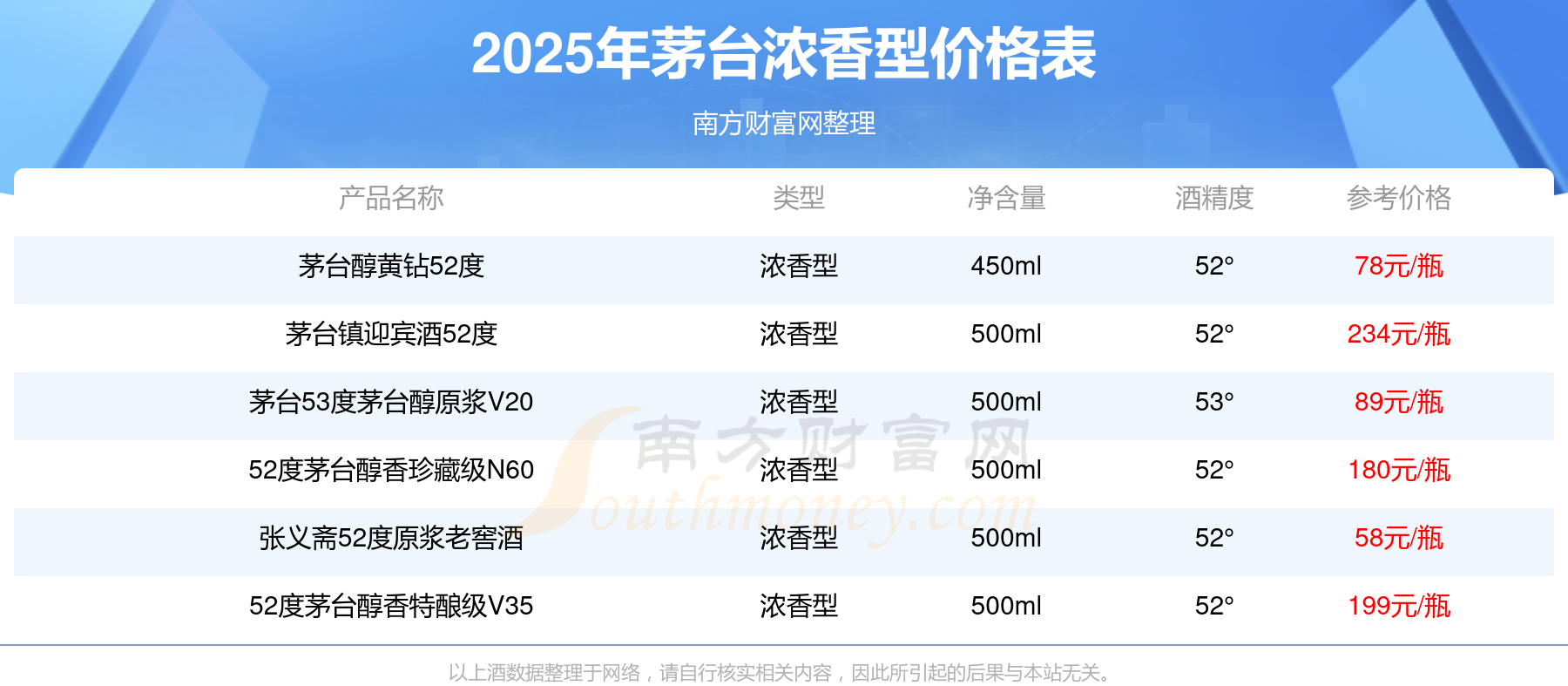 茅台浓香型酒最新价格2025:茅台镇迎宾酒52度参考价234元/瓶、52度茅台醇香特酿级V35参考价199元/瓶、52度茅台醇香珍藏级N60参考价180元/瓶、茅台53度茅台醇原浆V20参考价89元/瓶。