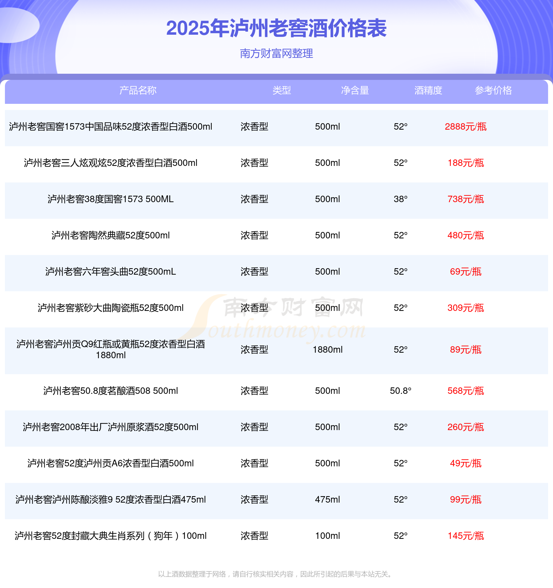 2025年泸州老窖酒泸州老窖国窖1573春酿鼠兆丰年E 55度、泸州老窖国窖1573生命中的那坛酒55度014、泸州老窖国窖1573春酿鼠兆丰年A 55度、泸州老窖国窖1573生命中的那坛酒55度013浓香型白酒1000ml、泸州老窖国窖1573生命中的那坛酒55度009 1000ml、泸州老窖国窖1573中国品味52度浓香型白酒500ml等最新价格如下:泸州老窖国窖1573春酿鼠兆丰年E 55度参考价17999元/瓶、泸州老窖国窖1573生命中的那坛酒55度014参考价9999元/瓶、泸州老窖国窖1573春酿鼠兆丰年A 55度参考价5088元/瓶、泸州老窖国窖1573生命中的那坛酒55度013浓香型白酒1000ml参考价4988元/瓶、泸州老窖国窖1573生命中的那坛酒55度009 1000ml参考价4288元/瓶、泸州老窖国窖1573中国品味52度浓香型白酒500ml参考价2888元/瓶。