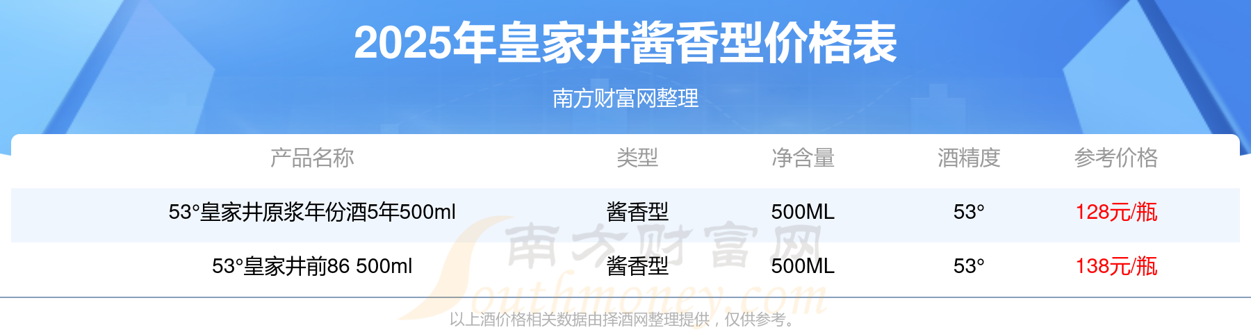 皇家井酱香型酒最新价格2025:53°皇家井前86 500ml参考价138元/瓶、53°皇家井原浆年份酒5年500ml参考价128元/瓶。