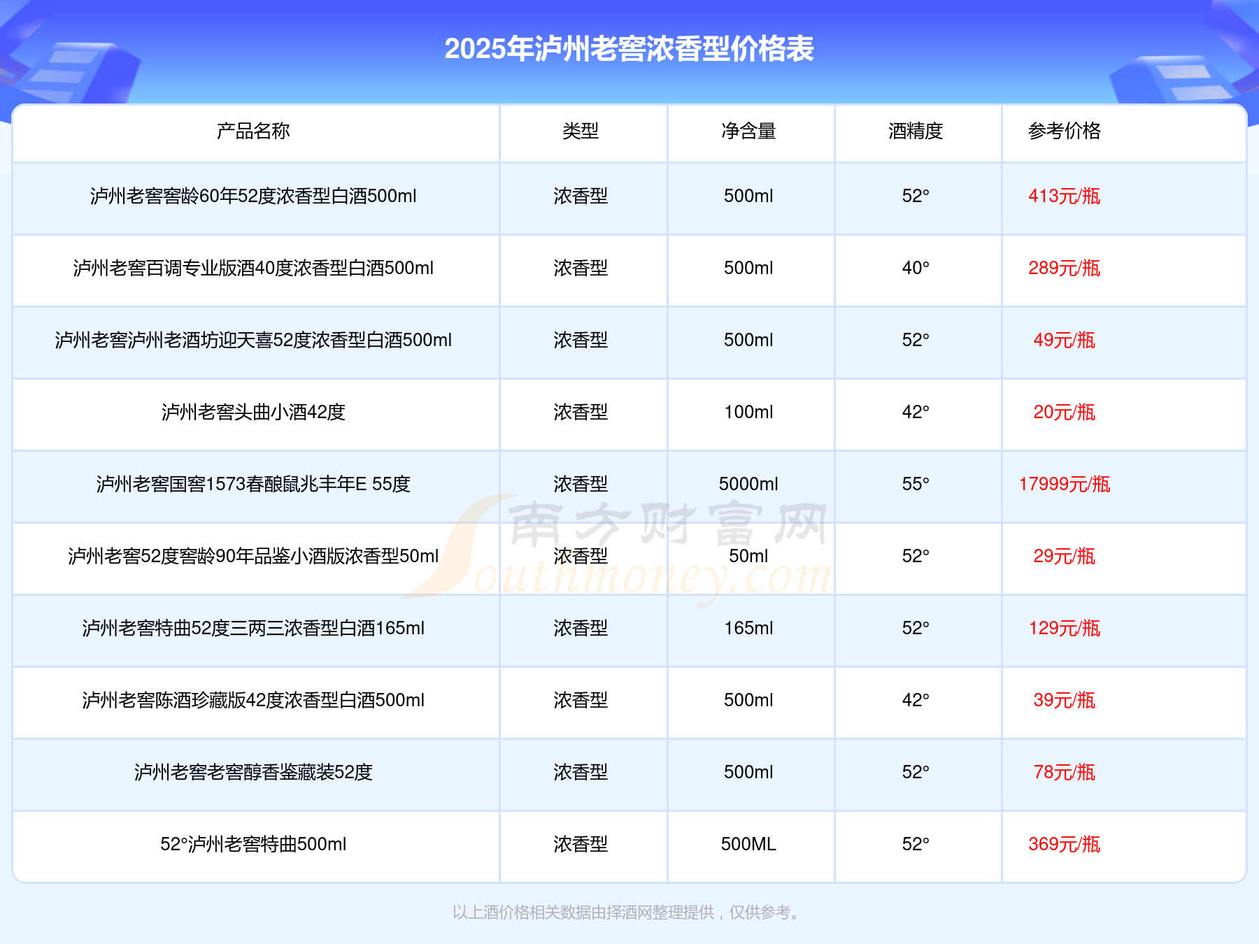2025年,泸州老窖国窖1573春酿鼠兆丰年E 55度、泸州老窖国窖1573生命中的那坛酒55度014、泸州老窖国窖1573春酿鼠兆丰年A 55度、泸州老窖国窖1573生命中的那坛酒55度013浓香型白酒1000ml、泸州老窖国窖1573生命中的那坛酒55度009 1000ml、泸州老窖国窖1573中国品味52度浓香型白酒500ml、泸州老窖国窖1573许燎源概念作品58度浓香型白酒1000ml等泸州老窖浓香型酒价格如下:泸州老窖国窖1573春酿鼠兆丰年E 55度参考价17999元/瓶、泸州老窖国窖1573生命中的那坛酒55度014参考价9999元/瓶、泸州老窖国窖1573春酿鼠兆丰年A 55度参考价5088元/瓶、泸州老窖国窖1573生命中的那坛酒55度013浓香型白酒1000ml参考价4988元/瓶、泸州老窖国窖1573生命中的那坛酒55度009 1000ml参考价4288元/瓶、泸州老窖国窖1573中国品味52度浓香型白酒500ml参考价2888元/瓶、泸州老窖国窖1573许燎源概念作品58度浓香型白酒1000ml参考价2680元/瓶。