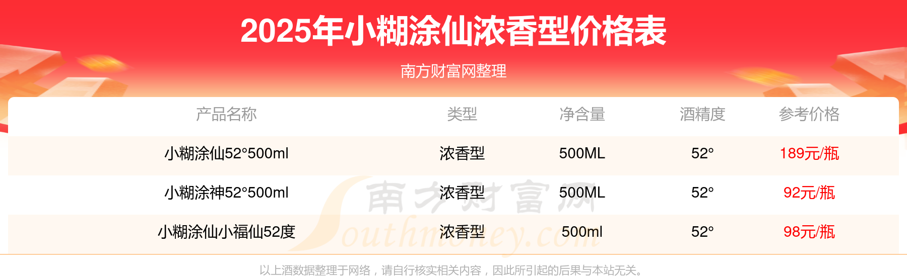 2025年,小糊涂仙52°500ml、小糊涂仙小福仙52度、小糊涂神52°500ml等小糊涂仙浓香型酒价格如下:小糊涂仙52°500ml参考价189元/瓶、小糊涂仙小福仙52度参考价98元/瓶、小糊涂神52°500ml参考价92元/瓶。