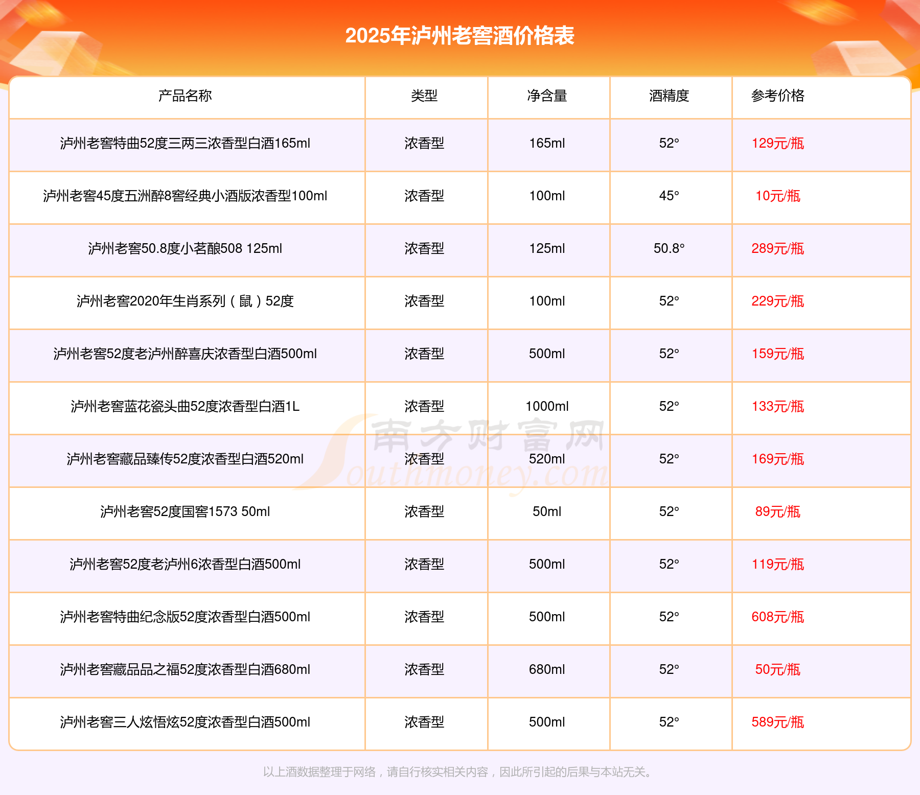 2025年,泸州老窖国窖1573春酿鼠兆丰年E 55度、泸州老窖国窖1573生命中的那坛酒55度014、泸州老窖国窖1573春酿鼠兆丰年A 55度、泸州老窖国窖1573生命中的那坛酒55度013浓香型白酒1000ml、泸州老窖国窖1573生命中的那坛酒55度009 1000ml等泸州老窖酒价格如下: