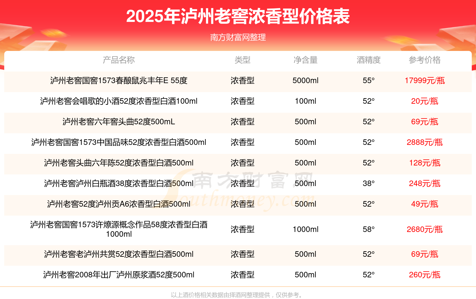 泸州老窖浓香型酒最新价格2025:泸州老窖国窖1573春酿鼠兆丰年E 55度参考价17999元/瓶、泸州老窖国窖1573生命中的那坛酒55度014参考价9999元/瓶、泸州老窖国窖1573春酿鼠兆丰年A 55度参考价5088元/瓶、泸州老窖国窖1573生命中的那坛酒55度013浓香型白酒1000ml参考价4988元/瓶、泸州老窖国窖1573生命中的那坛酒55度009 1000ml参考价4288元/瓶、泸州老窖国窖1573中国品味52度浓香型白酒500ml参考价2888元/瓶。