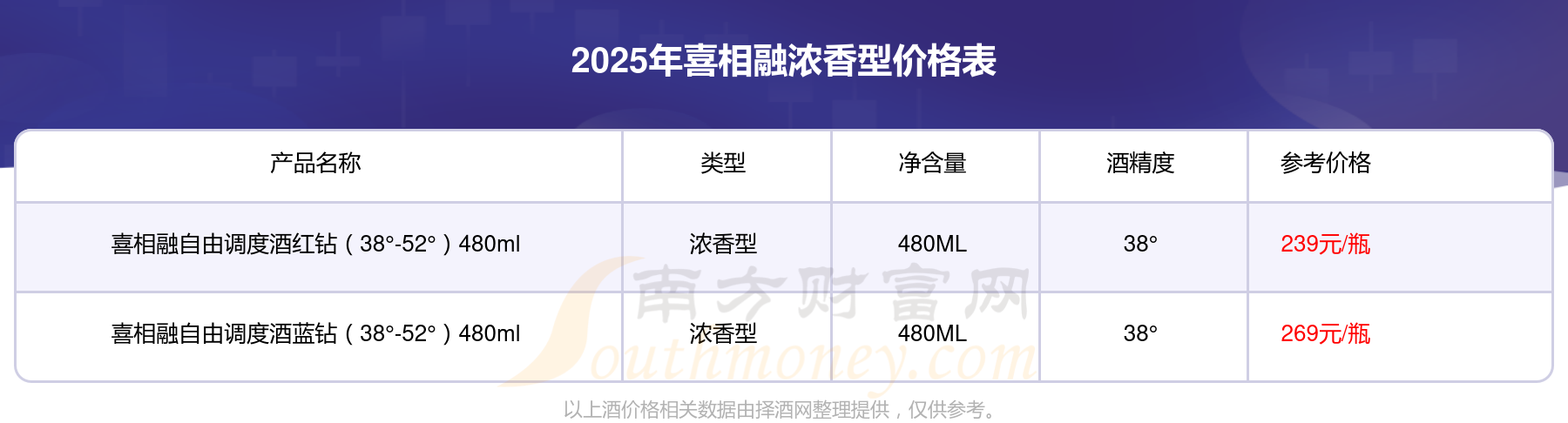 2025年,喜相融自由调度酒蓝钻(38°-52°)480ml、喜相融自由调度酒红钻(38°-52°)480ml等喜相融浓香型酒价格如下: