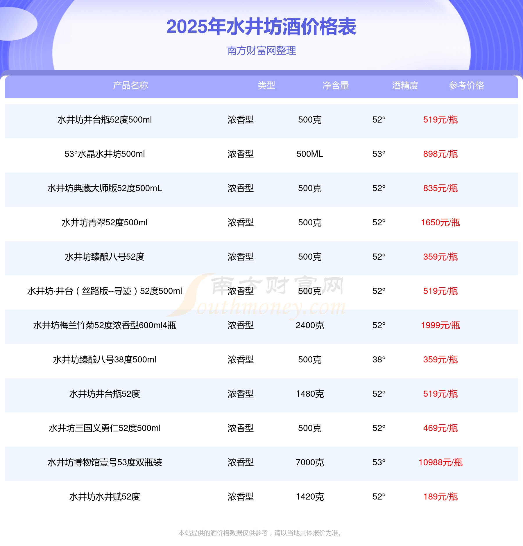 水井坊大坛收藏级原浆天球瓶66度参考价13999元/瓶、水井坊博物馆壹号53度双瓶装参考价10988元/瓶、53°水井坊公元十三600ml参考价2580元/瓶、水井坊梅兰竹菊52度浓香型600ml4瓶参考价1999元/瓶。
