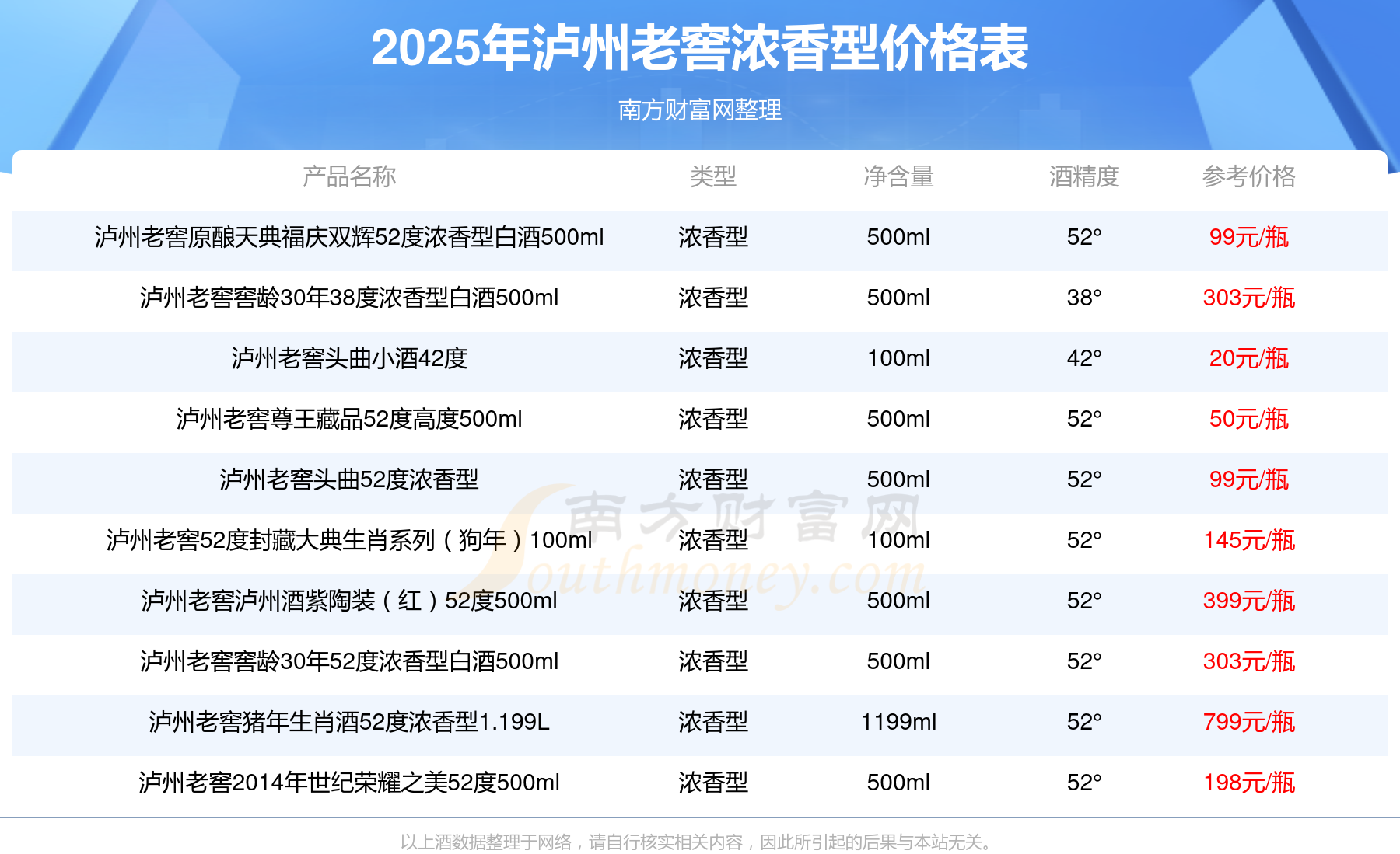 2025年,泸州老窖国窖1573春酿鼠兆丰年E 55度、泸州老窖国窖1573生命中的那坛酒55度014、泸州老窖国窖1573春酿鼠兆丰年A 55度、泸州老窖国窖1573生命中的那坛酒55度013浓香型白酒1000ml、泸州老窖国窖1573生命中的那坛酒55度009 1000ml、泸州老窖国窖1573中国品味52度浓香型白酒500ml、泸州老窖国窖1573许燎源概念作品58度浓香型白酒1000ml等泸州老窖浓香型酒参考价格如下:泸州老窖国窖1573春酿鼠兆丰年E 55度参考价17999元、泸州老窖国窖1573生命中的那坛酒55度014参考价9999元、泸州老窖国窖1573春酿鼠兆丰年A 55度参考价5088元、泸州老窖国窖1573生命中的那坛酒55度013浓香型白酒1000ml参考价4988元、泸州老窖国窖1573生命中的那坛酒55度009 1000ml参考价4288元、泸州老窖国窖1573中国品味52度浓香型白酒500ml参考价2888元、泸州老窖国窖1573许燎源概念作品58度浓香型白酒1000ml参考价2680元。
