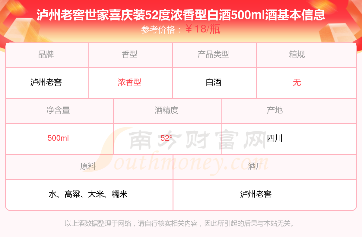 泸州老窖世家喜庆装52度浓香型白酒500ml基本信息