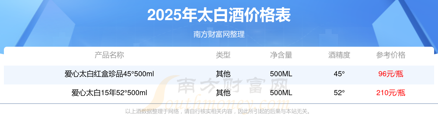 2025年,爱心太白15年52°500ml、爱心太白红盒珍品45°500ml等太白酒价格如下:爱心太白15年52°500ml参考价210元/瓶、爱心太白红盒珍品45°500ml参考价96元/瓶。