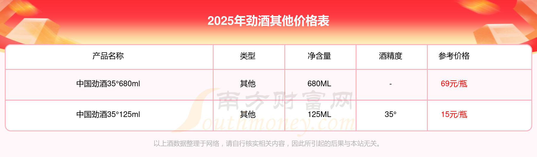 劲酒其他酒最新价格2025:中国劲酒35°680ml参考价69元/瓶、中国劲酒35°125ml参考价15元/瓶。