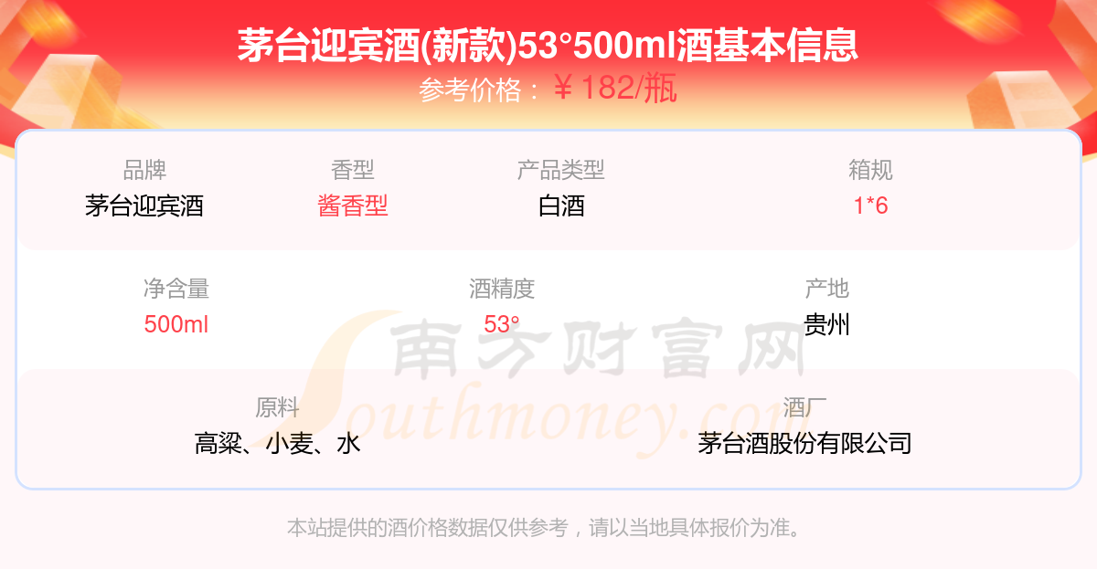 茅台迎宾酒是茅台酒系列产品。是以优质高粱、小麦为原料,秉承茅台酒传统工艺、精心酿造、勾兑而成的优质酱香型白酒。具有酱香明显、幽雅舒适、协调醇和、回味较长、空杯留香,饮后不上头的特点。