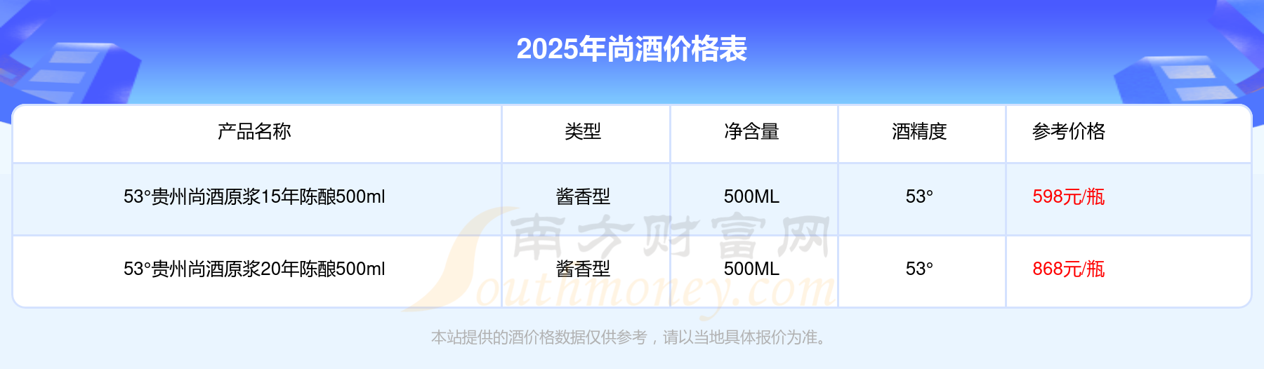 2025年,尚酒价格最高的是53°贵州尚酒原浆20年陈酿500ml,参考价868元,最低的是53°贵州尚酒原浆15年陈酿500ml,参考价598元,价格高低差为270元。