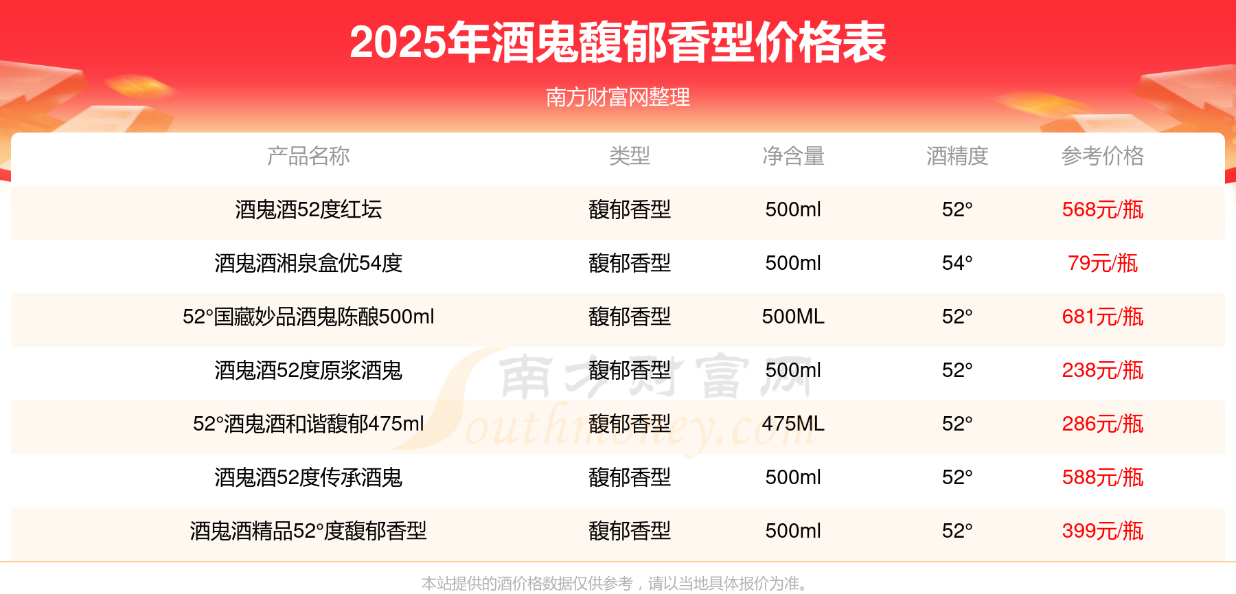 52°国藏妙品酒鬼陈酿500ml参考价681元/瓶、酒鬼酒52度传承酒鬼参考价588元/瓶、酒鬼酒52度红坛参考价568元/瓶、酒鬼酒精品52°度馥郁香型参考价399元/瓶、52°酒鬼酒和谐馥郁475ml参考价286元/瓶、酒鬼酒52度原浆酒鬼参考价238元/瓶、酒鬼酒湘泉盒优54度参考价79元/瓶。
