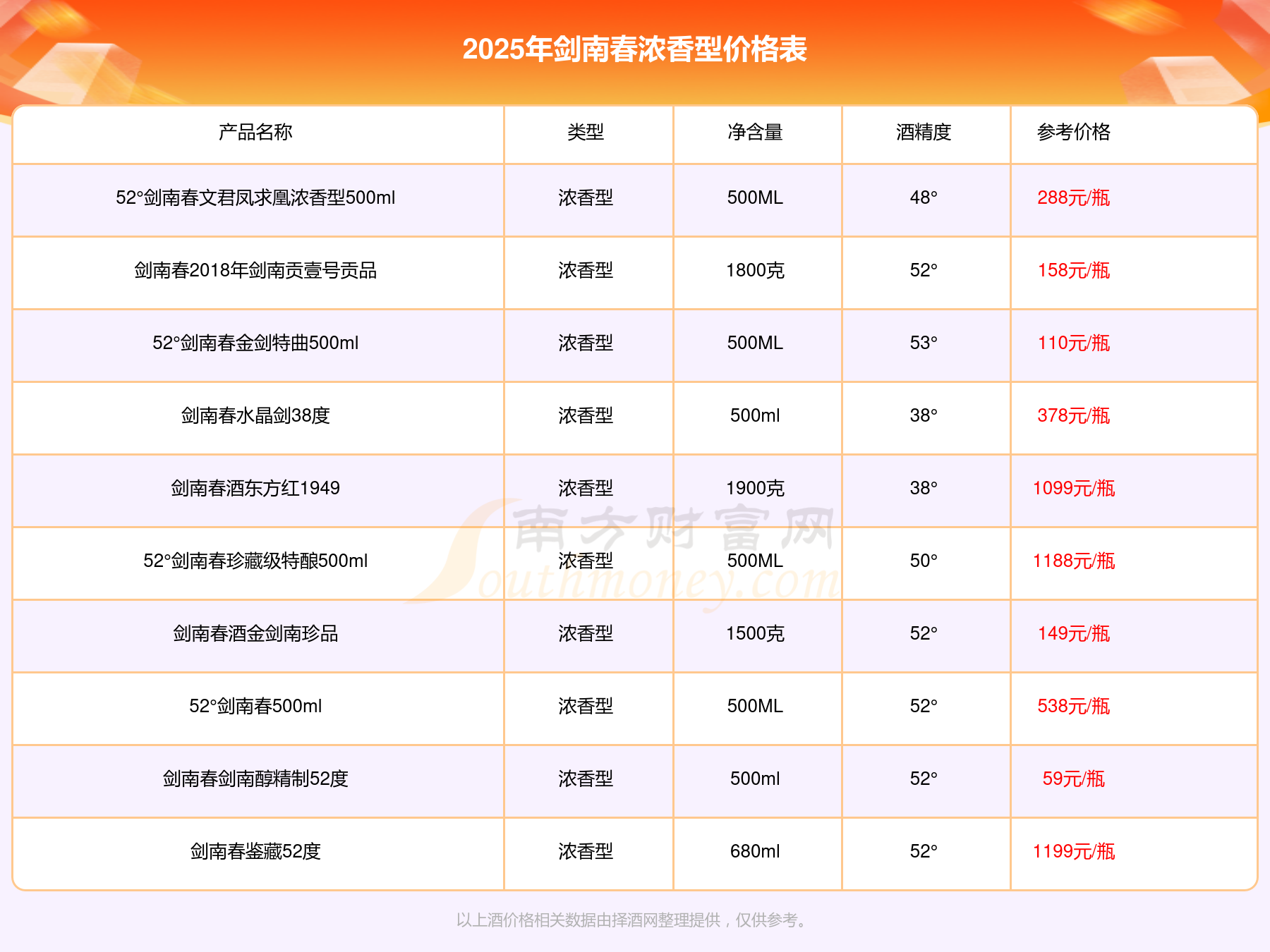 剑南春鉴藏52度参考价1199元/瓶、52°剑南春珍藏级特酿500ml参考价1188元/瓶、剑南春酒东方红1949参考价1099元/瓶、52°剑南春500ml参考价538元/瓶、52°剑南春水晶剑参考价489元/瓶。