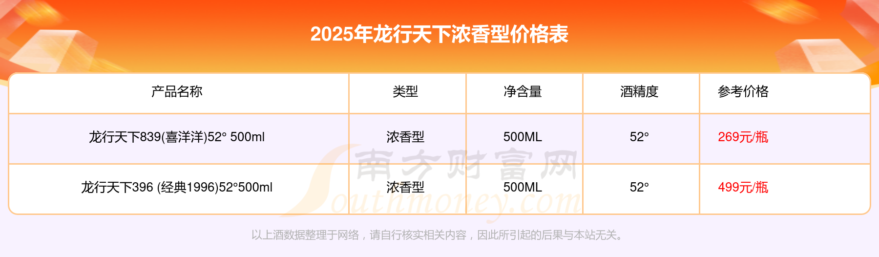 龙行天下396 (经典1996)52°500ml参考价499元/瓶、龙行天下839(喜洋洋)52° 500ml参考价269元/瓶。