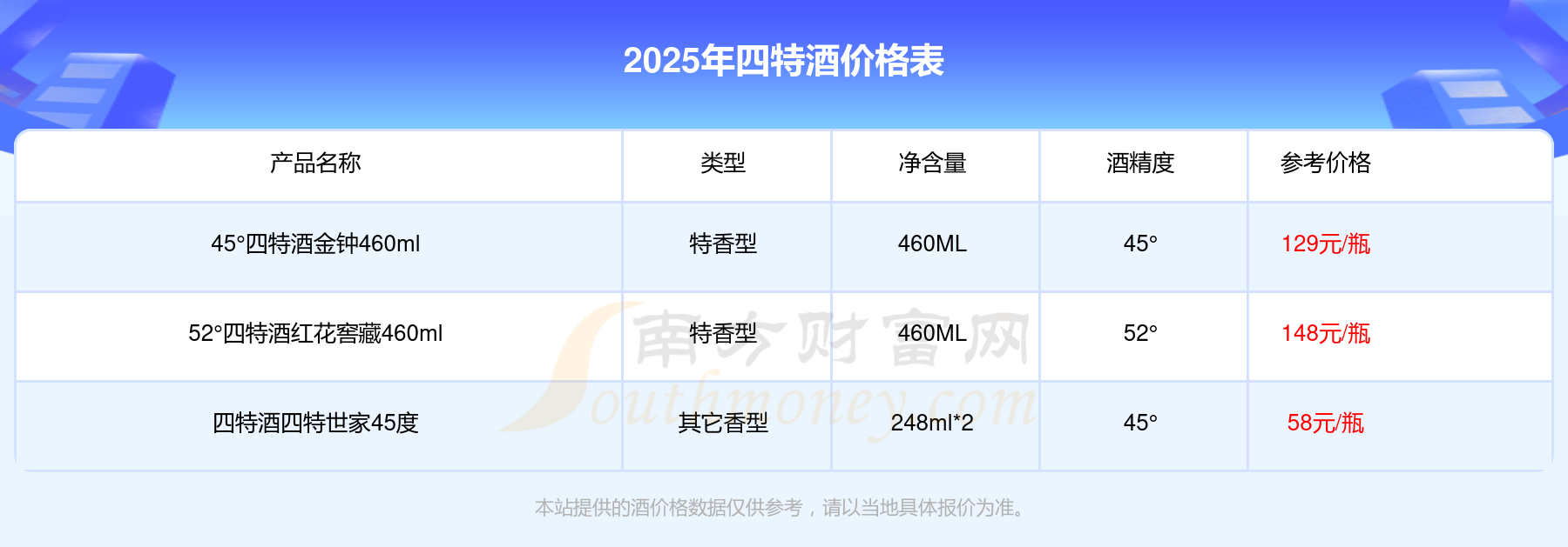 四特酒最新价格2025:52°四特酒红花窖藏460ml参考价148元/瓶、45°四特酒金钟460ml参考价129元/瓶、四特酒四特世家45度参考价58元/瓶。