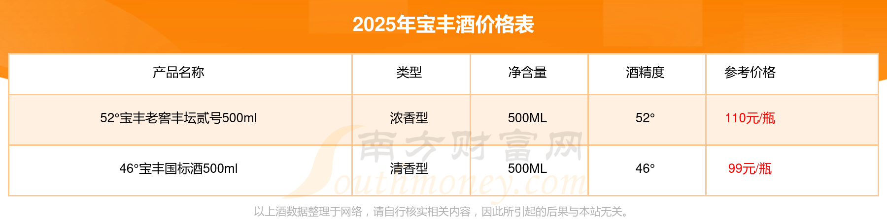 2025宝丰酒最新价格:52°宝丰老窖丰坛贰号500ml参考价110元/瓶、46°宝丰国标酒500ml参考价99元/瓶。
