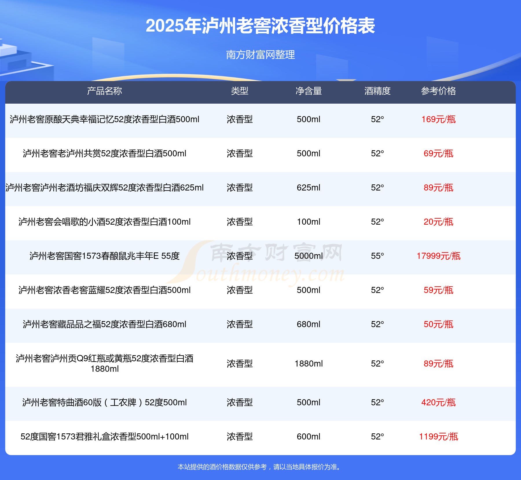 泸州老窖国窖1573春酿鼠兆丰年E 55度参考价17999元/瓶、泸州老窖国窖1573生命中的那坛酒55度014参考价9999元/瓶、泸州老窖国窖1573春酿鼠兆丰年A 55度参考价5088元/瓶、泸州老窖国窖1573生命中的那坛酒55度013浓香型白酒1000ml参考价4988元/瓶、泸州老窖国窖1573生命中的那坛酒55度009 1000ml参考价4288元/瓶、泸州老窖国窖1573中国品味52度浓香型白酒500ml参考价2888元/瓶、泸州老窖国窖1573许燎源概念作品58度浓香型白酒1000ml参考价2680元/瓶。