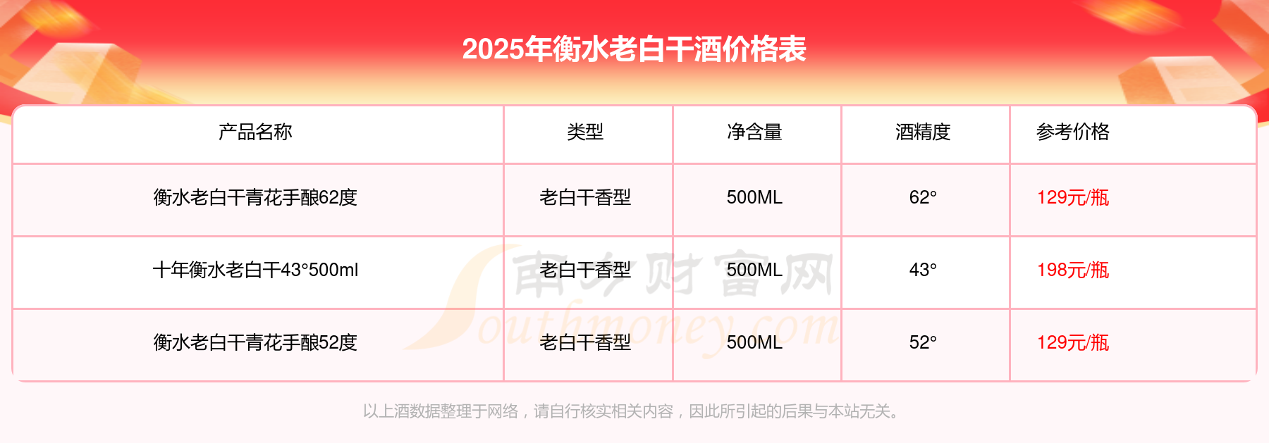 十年衡水老白干43°500ml参考价198元/瓶、衡水老白干青花手酿52度参考价129元/瓶、衡水老白干青花手酿62度参考价129元/瓶。
