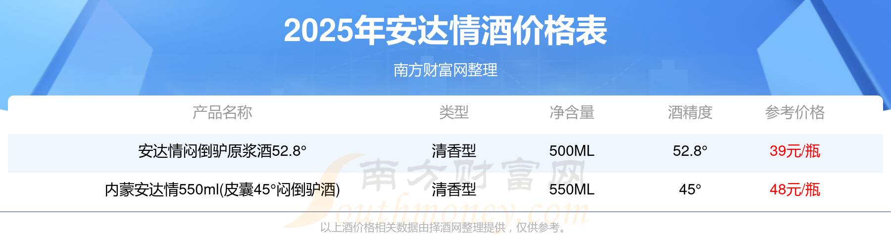 安达情酒价格最高的是内蒙安达情550ml(皮囊45°闷倒驴酒),参考价48元/瓶,最低的是安达情闷倒驴原浆酒52.8°,参考价39元/瓶,价格高低差为9元/瓶。