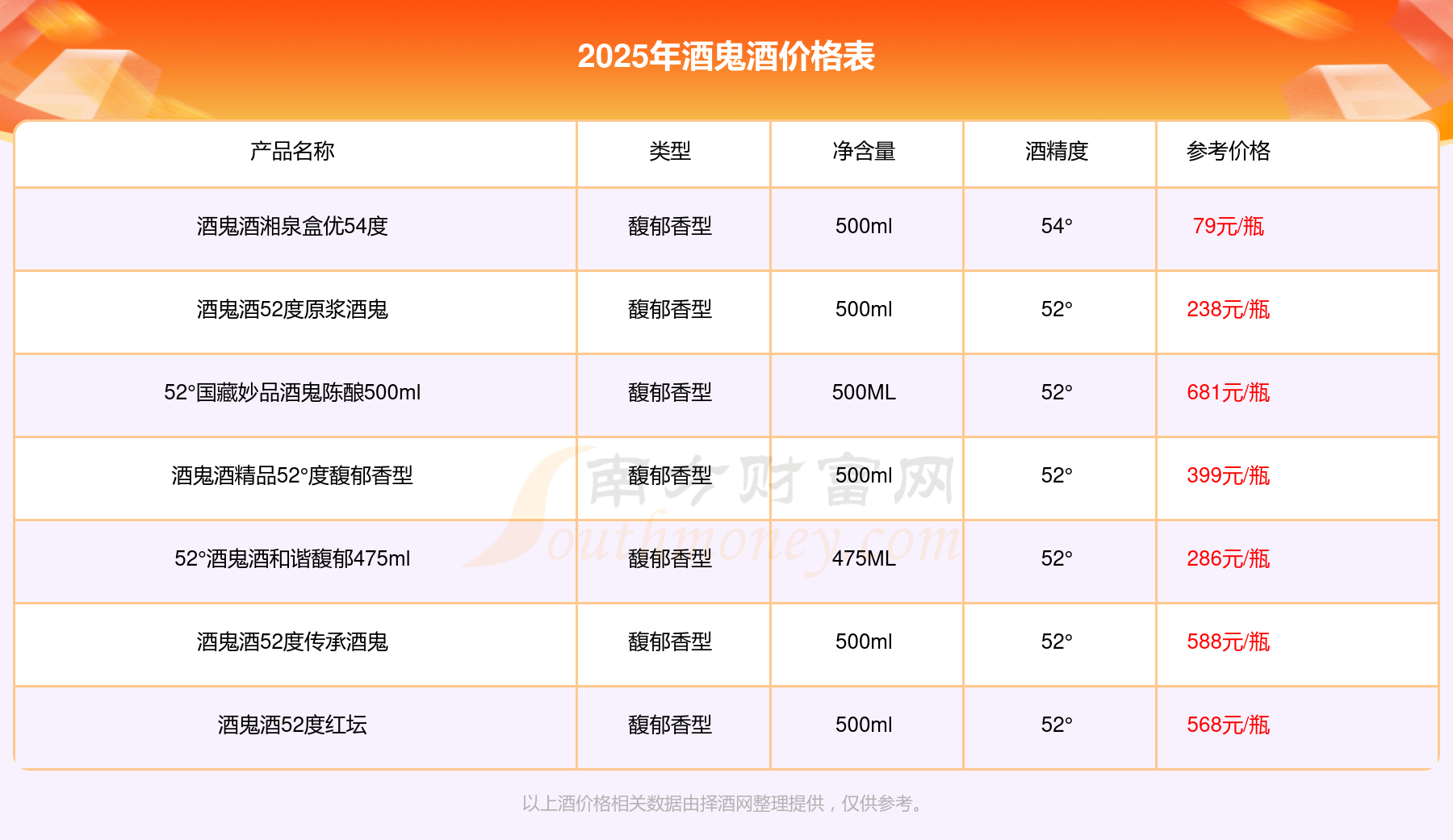 2025年,52°国藏妙品酒鬼陈酿500ml、酒鬼酒52度传承酒鬼、酒鬼酒52度红坛、酒鬼酒精品52°度馥郁香型、52°酒鬼酒和谐馥郁475ml、酒鬼酒52度原浆酒鬼、酒鬼酒湘泉盒优54度等酒鬼酒价格如下:52°国藏妙品酒鬼陈酿500ml参考价681元/瓶、酒鬼酒52度传承酒鬼参考价588元/瓶、酒鬼酒52度红坛参考价568元/瓶、酒鬼酒精品52°度馥郁香型参考价399元/瓶、52°酒鬼酒和谐馥郁475ml参考价286元/瓶、酒鬼酒52度原浆酒鬼参考价238元/瓶、酒鬼酒湘泉盒优54度参考价79元/瓶。