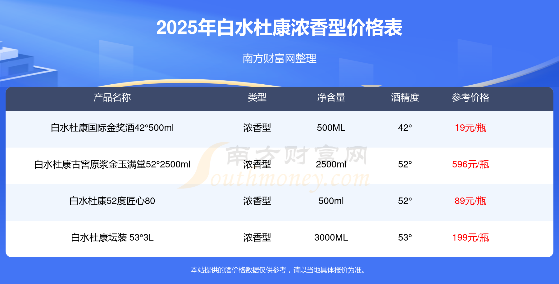 2025年,白水杜康古窖原浆金玉满堂52°2500ml、白水杜康坛装 53°3L、白水杜康52度匠心80、白水杜康国际金奖酒42°500ml等白水杜康浓香型酒参考价格如下:白水杜康古窖原浆金玉满堂52°2500ml参考价596元、白水杜康坛装 53°3L参考价199元、白水杜康52度匠心80参考价89元、白水杜康国际金奖酒42°500ml参考价19元。