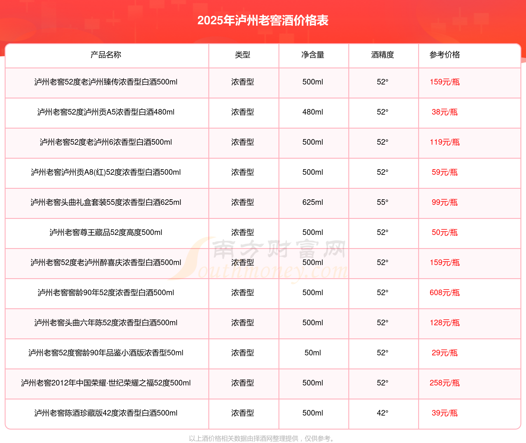2025泸州老窖酒最新价格:泸州老窖国窖1573春酿鼠兆丰年E 55度参考价17999元/瓶、泸州老窖国窖1573生命中的那坛酒55度014参考价9999元/瓶、泸州老窖国窖1573春酿鼠兆丰年A 55度参考价5088元/瓶、泸州老窖国窖1573生命中的那坛酒55度013浓香型白酒1000ml参考价4988元/瓶、泸州老窖国窖1573生命中的那坛酒55度009 1000ml参考价4288元/瓶。