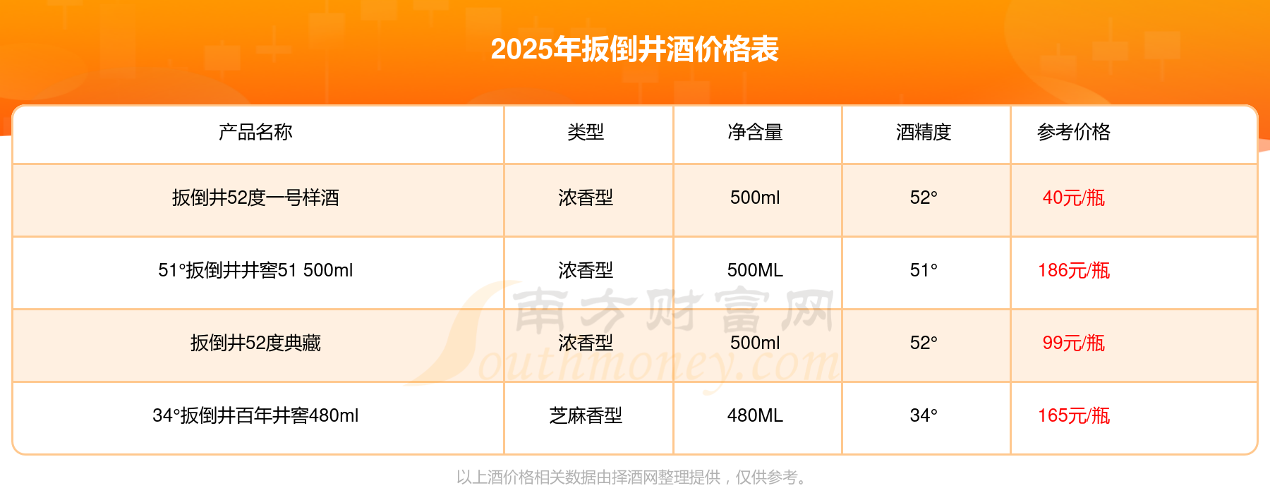 51°扳倒井井窖51 500ml参考价186元/瓶、34°扳倒井百年井窖480ml参考价165元/瓶、扳倒井52度典藏参考价99元/瓶。