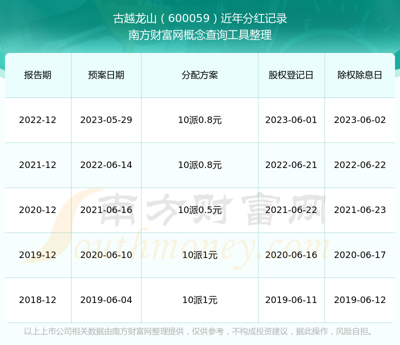 古越龙山最新一次公布的分红方案为10派0.8元。本次权益分派股权登记日为2023年6月1日,除权除息日为2023年6月2日,派息日为2023年6月2日。