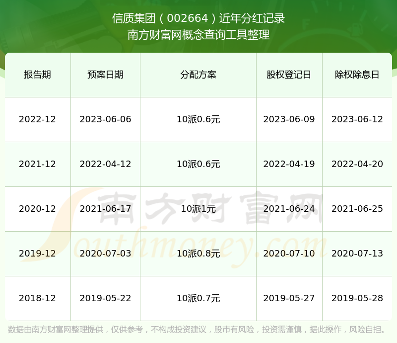 信质集团最新一次公布的分红方案为10派0.6元。本次权益分派股权登记日为2023年6月9日,除权除息日为2023年6月12日,派息日为2023年6月12日。