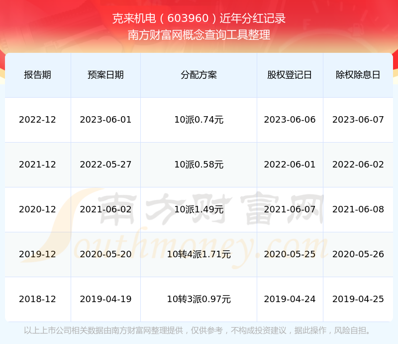 克来机电最新一次公布的分红方案:10派0.74元。