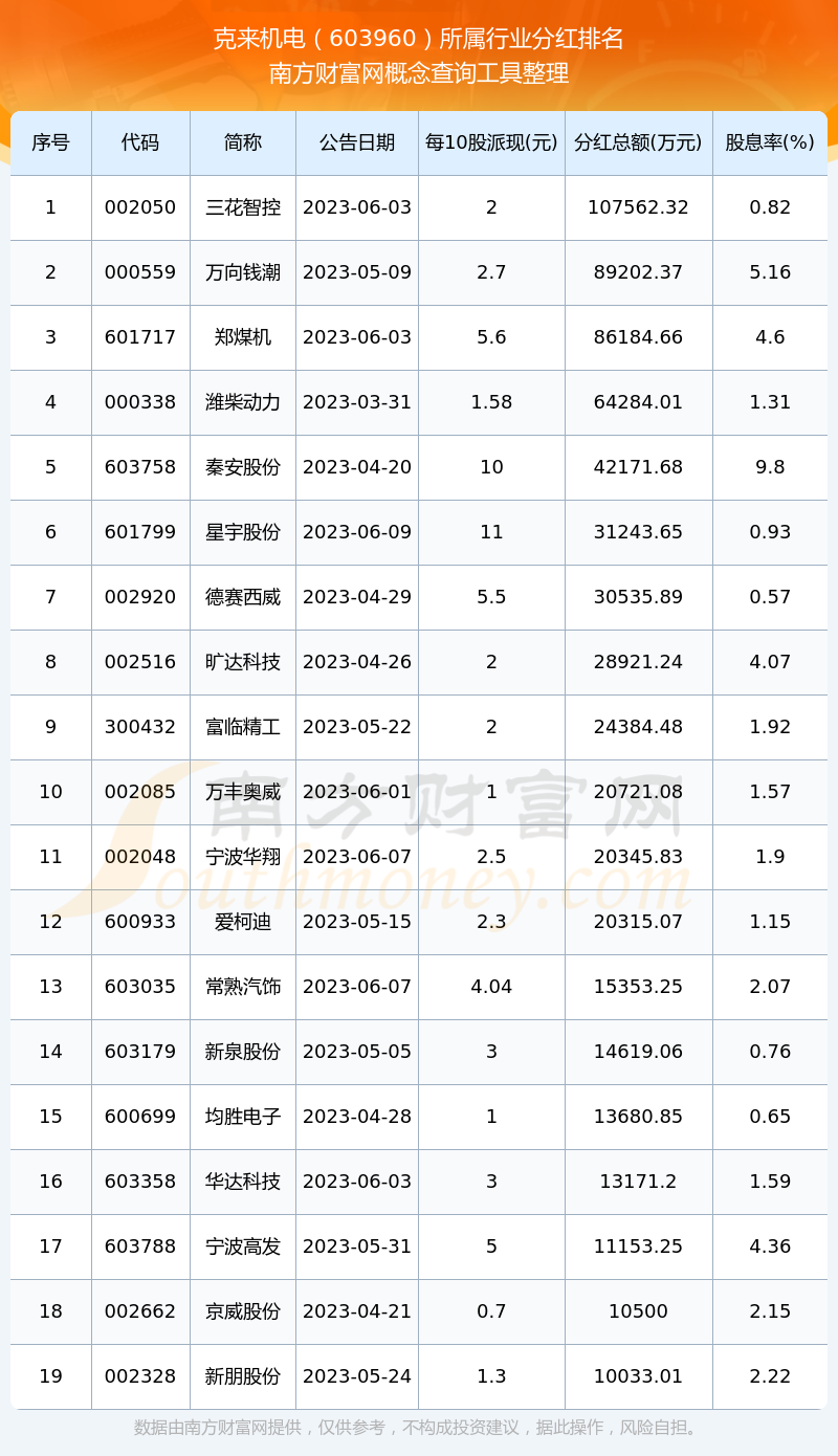 二、克来机电603960行业分红排名