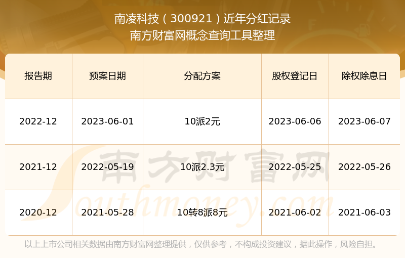 南凌科技最新一次公布的分红方案为10派2元。本次权益分派股权登记日为2023年6月6日,除权除息日为2023年6月7日,派息日为2023年6月7日。