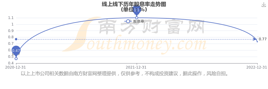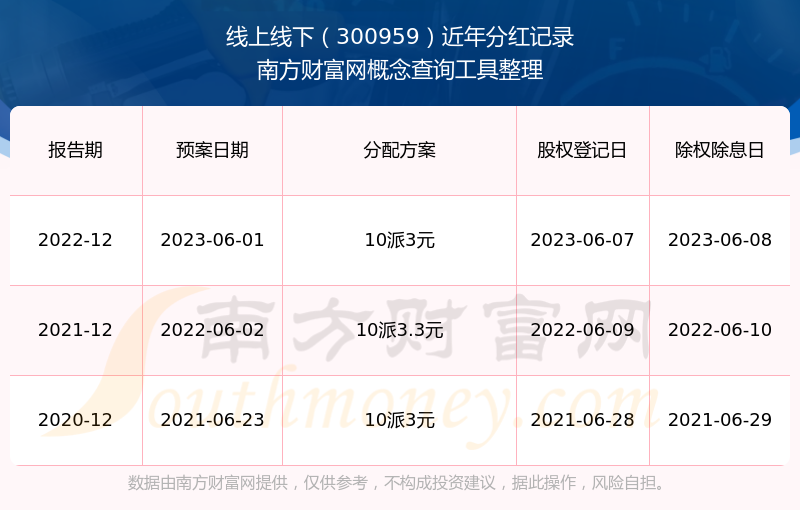 线上线下最新一次公布的分红方案为10派3元。本次权益分派股权登记日为2023年6月7日,除权除息日为2023年6月8日,派息日为2023年6月8日。