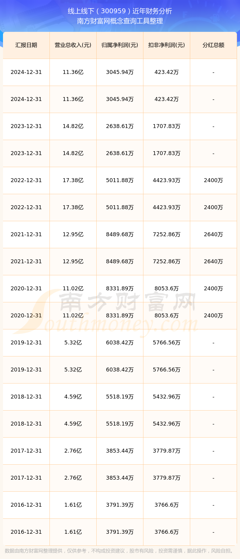 2024年报显示,线上线下实现营收11.36亿,同比增长-23.37%;净利润3045.94万,同比增长15.44%;毛利率7.97%。