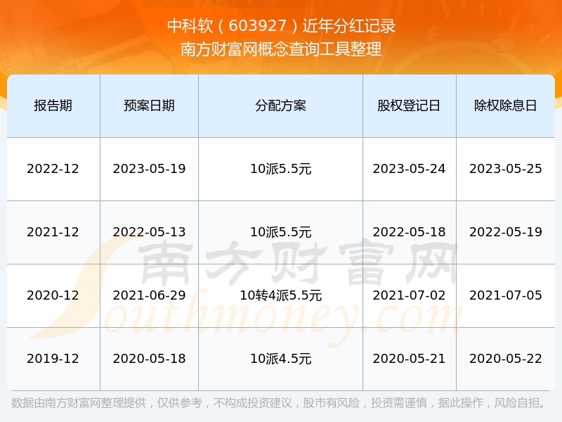 中科软最新一次公布的分红方案为10派5.5元。本次权益分派股权登记日为2023年5月24日,除权除息日为2023年5月25日,派息日为2023年5月25日。