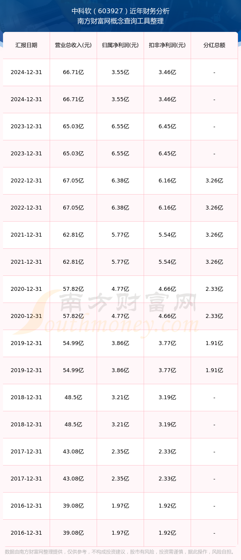 中科软公司2024年实现营业收入66.71亿元,同比增长2.59%;净利润3.55亿元,同比增长-45.76%;毛利率25.93%。