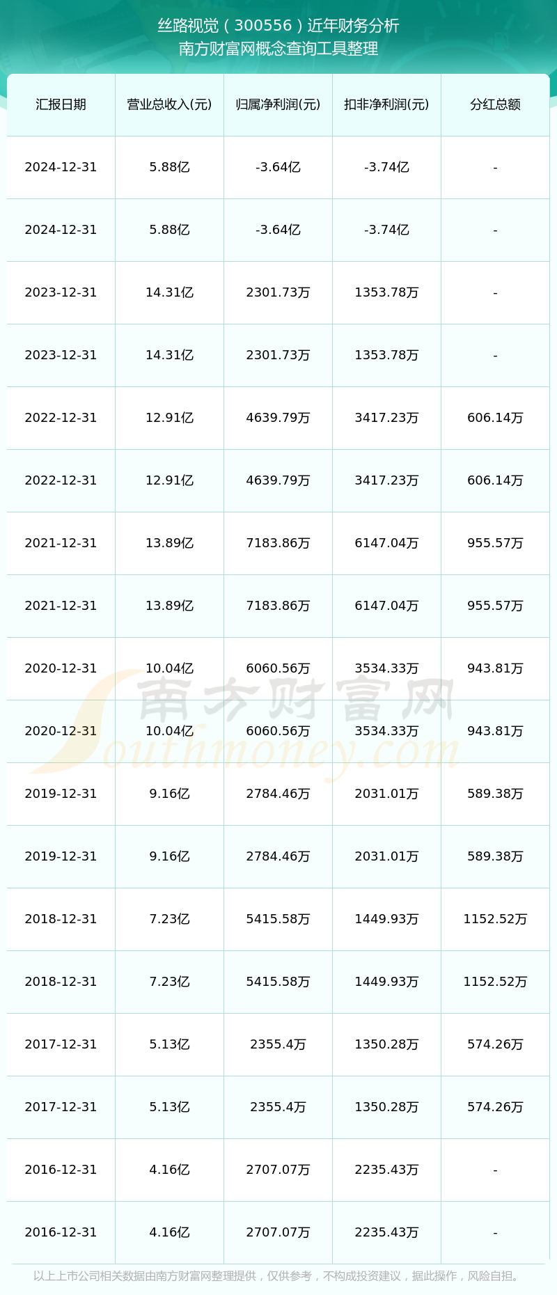 丝路视觉2024年总营收5.88亿,同比增长-58.91%;净利润-3.64亿,同比增长-1679.87%;销售毛利率-15.72%。
