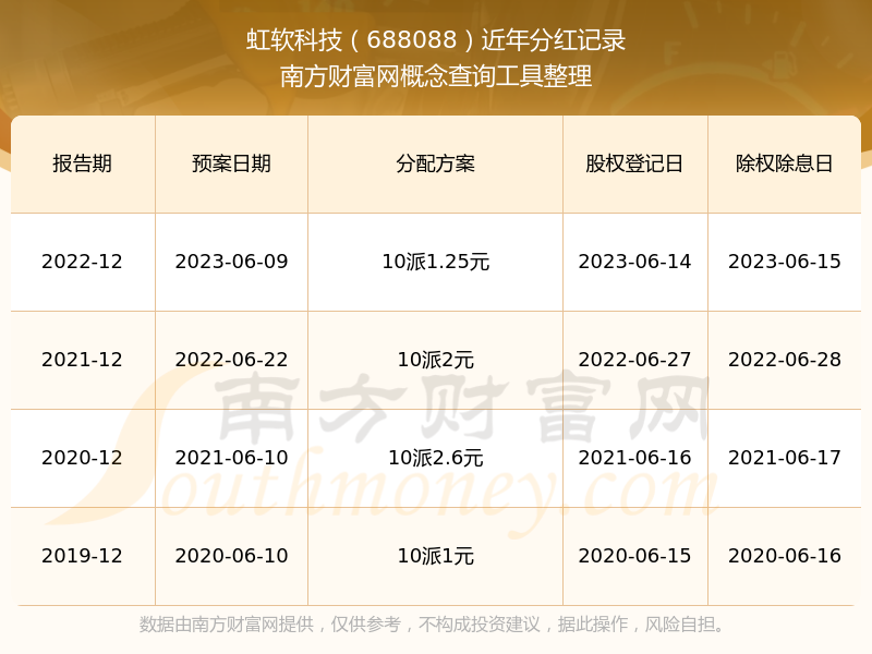 虹软科技最新一次公布的分红方案为10派1.25元。本次权益分派股权登记日为2023年6月14日,除权除息日为2023年6月15日,派息日为2023年6月15日。