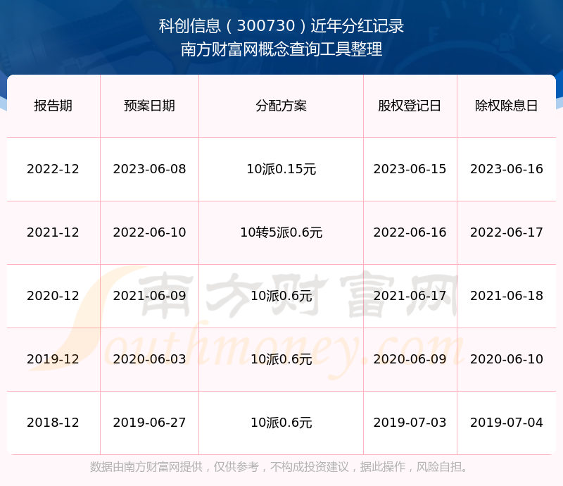 科创信息最新一次公布的分红方案为10派0.15元。本次权益分派股权登记日为2023年6月15日,除权除息日为2023年6月16日,派息日为2023年6月16日。